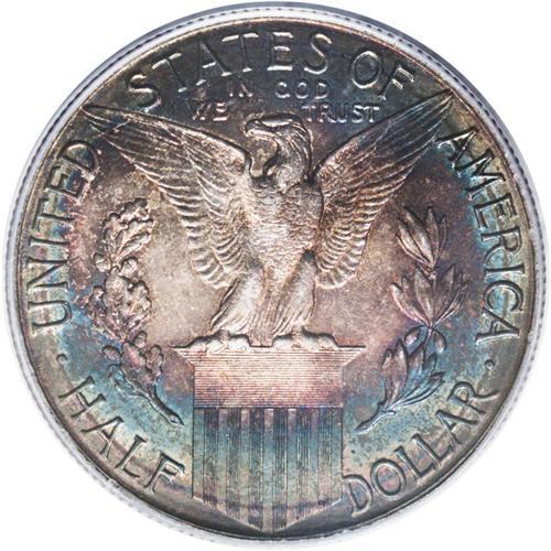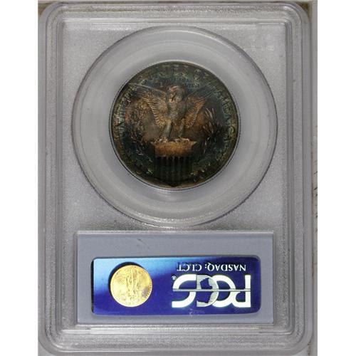 <B>1915-S<50C> Panama-Pacific MS64 PCGS.</B></I> Deep blue-green, tobacco-brown, and lime toning envelop this satiny and meticulously struck example. This scarcer type is seldom found with such comprehensive and vigorous patina on both sides. The mintmark is repunched directly north.