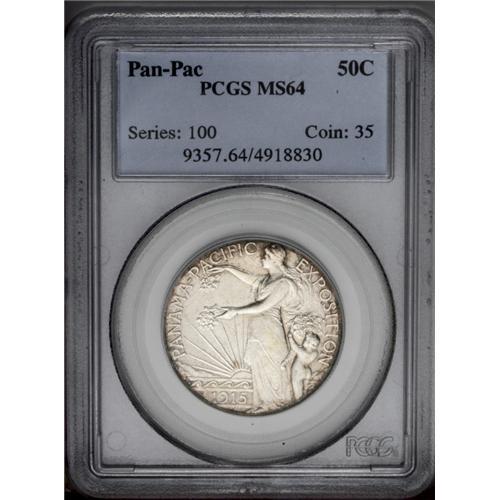 <B>1915-S<50C> Panama-Pacific MS64 PCGS.</B></I> Lustrous surfaces show wisps of reddish-tan and cobalt-blue toning around the peripheries, and occasional hints of light gold-tan in the centers. Sharp impressions appear on the design elements, and a few minor marks seen under magnification on the obverse central device define the grade. <BR><BR><B>Important notice:</B> Heritage usually auctions material at the rate of 200-250 lots per hour. On some occasions eBay Live bid software or the Internet may not be able to keep up with the pace of the auction. We recommend placing a realistic absentee bid now as insurance to avoid disappointment. Occasionally the auctioneer may eliminate or reject an eBay Live bid, and the auctioneer may also reopen a lot after the close of the eBay live bidding (usually because we missed an audience bid), and may reject your bid even if it shows you as the winning bidder. By bidding via eBay Live, you agree that Heritage may award the lot to another bidder at its sole discretion under the circumstances described above or any other reasonable circumstances. Since eBay bids are not shown to us until we open the lot on the floor, we treat those bids just like floor bids. In most cases the floor responds before the eBay bid is presented to us, due to Internet lag time, so for consistency we have made it a policy that floor bids are always considered first over tie eBay live bids. Also please note that all Heritage lots purchased through eBay Live carry a 20% Buyer's Premium. Please make sure you read the Terms and Conditions before you bid. This lot is being auctioned in conjunction with a live floor auction by Heritage Galleries & Auctioneers. All final auction and invoice information will be supplied by Heritage Galleries & Auctioneers, and all other information should be considered preliminary. Lot:5053 <BR><BR><B>Winning Notification and Billing:</B> After the FINAL session in this auction is complete, Heritage will send e-mail and snail mail invoices. This process normally takes several days. All final auction and invoice information will be supplied by Heritage Galleries & Auctioneers, and all other information should be considered preliminary. <BR><BR>This auction will be conducted on a live auction floor and over the Internet through eBay Live. If you choose to place an absentee bid, please take a moment to <font color='#0000ff'><u><a href='http://pages.ebay.com/liveauctions/help/before/laabsentee.html'>learn how eBay Live absentee bidding works</a></u></font><font color='#000000'>