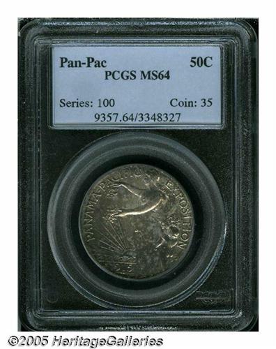 <B>1915-S<50C> Panama-Pacific MS64 PCGS.</B></I> Original toning covers both sides of this pleasingly lustrous near-Gem, which is also well struck and nicely preserved. The distraction-free surfaces make this piece seem conservatively graded.
