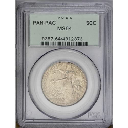 <B>1915-S<50C> Panama-Pacific MS64 PCGS.</B></I> Warm golden-gray toning overlies lustrous surfaces that exhibit a few small toning spots on the reverse. A few shallow scratch-like marks on the reverse shield are mentioned for accuracy.