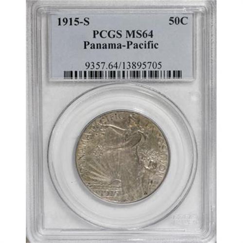 <B>1915-S 50C Panama-Pacific MS64 PCGS.</B></I> Medium russet-gold toning drapes this lustrous and carefully preserved near-Gem. Free from distracting marks, and pleasing to the eye. Accompanying the lot is a fascinating 1915 picture booklet published by the Panama-Pacific International Exposition Company, and six different postcards for the Pan-Pac Expo, two are used with pre-Expo San Francisco postmarks dated Mar. 4, 1914 and Oct 19, 1910.<BR><I>From The Frank DuVall Collection of U.S. Commemoratives.</B></I><BR><BR><b>Shipping:</b> Coins & Currency (<a target="_blank" href="http://www.heritageauctions.com/common/shipping.php">view shipping information</a>)