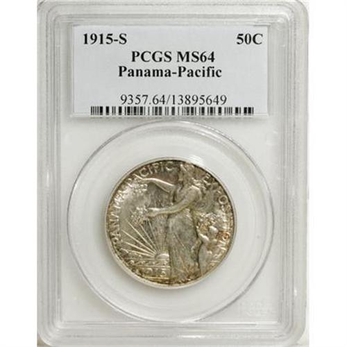<B>1915-S 50C Panama-Pacific MS64 PCGS.</B></I> A dazzling representative that easily matches the eye appeal of the typical Gem survivor, but wispy abrasions on Columbia's gown necessitates an MS64 rating. Attractive russet toning is seen here and there at the margins.<BR><I>From The Frank DuVall Collection of U.S. Commemoratives.</B></I><BR><BR><b>Shipping:</b> Coins & Currency (<a target="_blank" href="http://www.heritageauctions.com/common/shipping.php">view shipping information</a>)