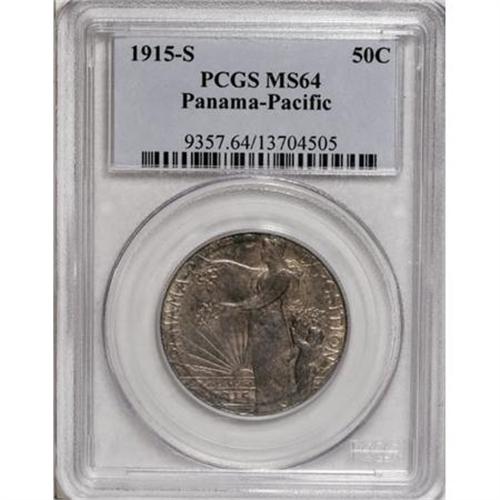 <B>1915-S 50C Panama-Pacific MS64 PCGS.</B></I> Elegant green-gold, rose, and violet patina drapes the softly lustrous surfaces of this Choice Panama-Pacific half. Pleasing overall, though a handful of light marks on the devices combine to preclude Gem status.<BR><BR><b>Shipping:</b> Coins & Currency (<a target="_blank" href="http://www.heritageauctions.com/common/shipping.php">view shipping information</a>)