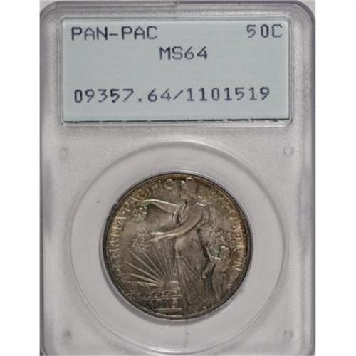 <B>1915-S 50C Panama-Pacific MS64 PCGS.</B></I> An attractive Choice example of this early silver commemorative half, luminous beneath gold-orange and silver-green patina with a strong element of rose at the lower reverse. Surprising surface quality for the grade assigned. Housed in a first-generation PCGS holder.<BR><BR><b>Shipping:</b> Coins & Currency (<a target="_blank" href="http://www.heritageauctions.com/common/shipping.php">view shipping information</a>)