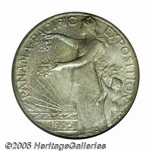 <B>1915-S<50C> Panama-Pacific MS65 NGC.</B></I> A superior example of this key and highly collectible commemorative issue. Designed by Charles Barber and George Morgan, professional engravers in the Mint and not amateurs as with many commemorative issues, the design of this coin displays the highest artistic accomplishment. Each side presents an original mix of argent-gray and crimson-red patina naturally gained from many years of careful storage in a sulphur-based envelope. Even close examination fails to reveal any marks or spots that might detract. Worth a close look and a strong bid by the commemorative specialist.