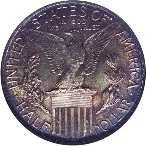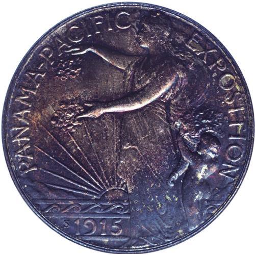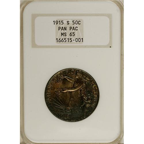 <B>1915-S 50C Panama-Pacific MS65 NGC.</B></I> In addition to smooth, distraction-free surfaces, this well defined Gem exhibits a rich overlay of original charcoal-copper and antique-gold toning punctuated with accents of aqua-blue and mauve. A relatively scarce commemorative type at the MS65 level, this attractive example is sure to focus the attention of the aficionado of toned coins.<BR><BR><b>Shipping:</b> Coin/Currency (<a target="_blank" href="http://www.heritageauctions.com/common/shipping.php">view shipping information</a>)