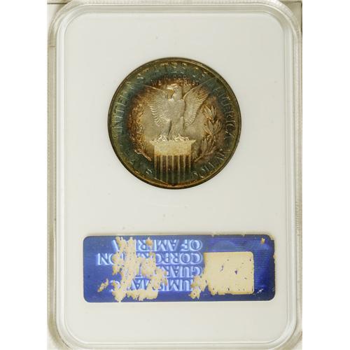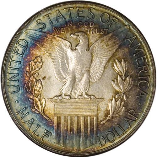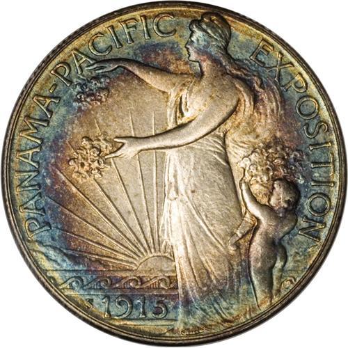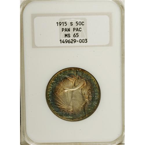 <B>1915-S 50C Panama-Pacific MS65 NGC.</B></I> Rings of colorful patina surround silver-gray centers on this lustrous Gem. Outer bands of gold-green and aqua turn to ocean-blue, reddish-orange, and finally gold. The Panama-Pacific half dollar was the first silver commemorative to feature a statutory inscription, IN GOD WE TRUST, though the full suite, including IN GOD WE TRUST and LIBERTY, would not appear on a silver commemorative until the Lincoln half of 1918.<BR><I>From The Cary & Cheryl Porter Collection.</B></I><BR><BR><b>Shipping:</b> Coins & Currency (<a target="_blank" href="http://www.heritageauctions.com/common/shipping.php">view shipping information</a>)