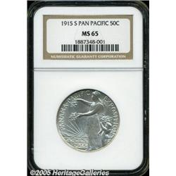 <B>1915-S 50C Panama-Pacific MS65 NGC.</B></I> Scintillating mint frost characterizes this immaculate Gem. Fully brilliant overall, there is just the lightest hint of milky color visible only as the coin turns under a light. A lovely Pan-Pac Half.