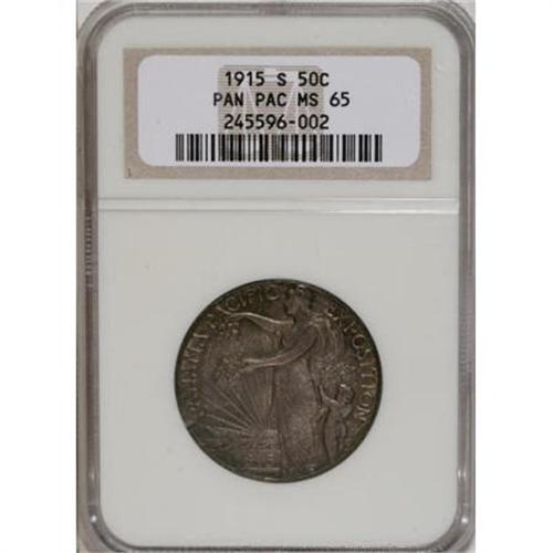 <B>1915-S 50C Panama-Pacific MS65 NGC.</B></I> A richly toned, pleasingly preserved Gem that offers subtle luminosity beneath deep, dusky violet and golden-tan shadings. Excellent definition and visual appeal for this early classic commemorative issue.<BR><BR><b>Shipping:</b> Coins & Currency (<a target="_blank" href="http://www.heritageauctions.com/common/shipping.php">view shipping information</a>)