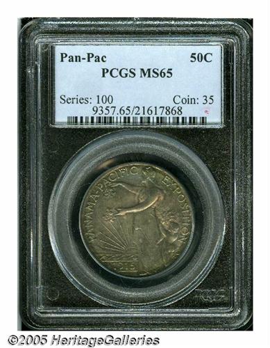 <B>1915-S<50C> Panama-Pacific MS65 PCGS.</B></I> Fully lustrous. Warmly toned in intermingled hues of golden brown, pewter gray, blue, and violet.