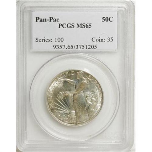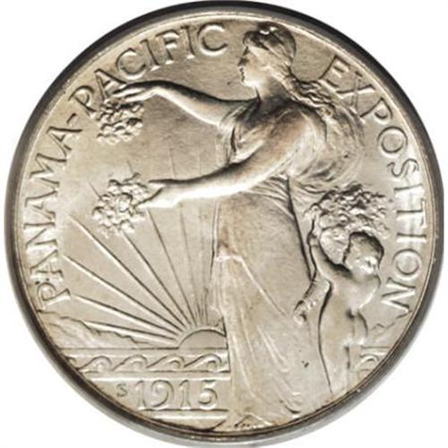 <B>1915-S 50C Panama-Pacific MS65 PCGS.</B></I> Scintillating mint frost characterizes this immaculate Gem. Virtually brilliant, there is just the lightest accent of rose patina seen over the central obverse devices. An impressive strike brings out excellent definition on the design elements, and close inspection reveals just a few trivial, inoffensive marks on the obverse that preclude an even higher grade. <BR><BR><b>Shipping:</b> Coins & Currency (<a target="_blank" href="http://www.heritageauctions.com/common/shipping.php">view shipping information</a>)
