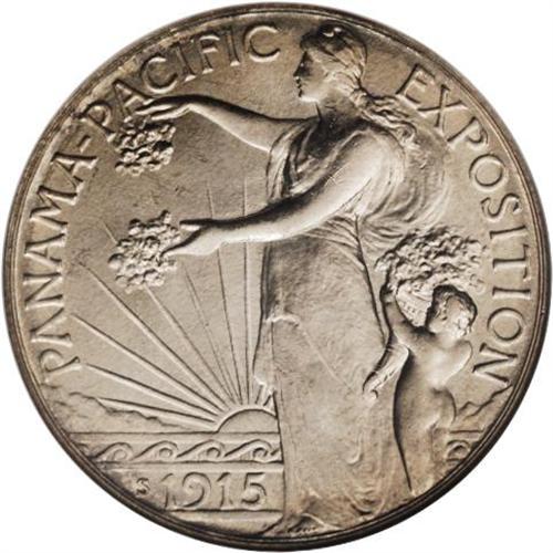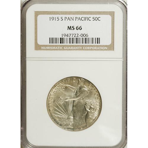 <B>1915-S 50C Panama-Pacific MS66 NGC.</B></I> An amazing example with brilliant satin luster that is mostly brilliant white, framed by a trace of champagne toning near the borders on each side. All design elements are sharply detailed and the surfaces are nearly perfect with only the slightest imperfections. Only 63 finer examples of the variety are currently holdered by NGC.<BR><BR><b>Shipping:</b> Coins & Currency (<a target="_blank" href="http://www.heritageauctions.com/common/shipping.php">view shipping information</a>)