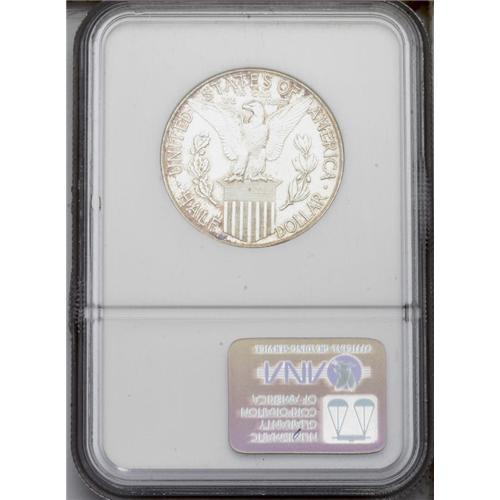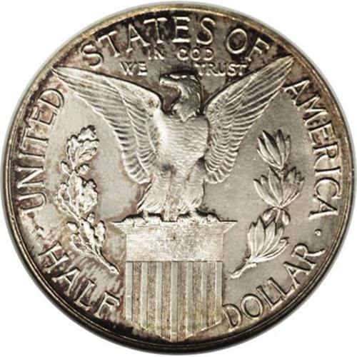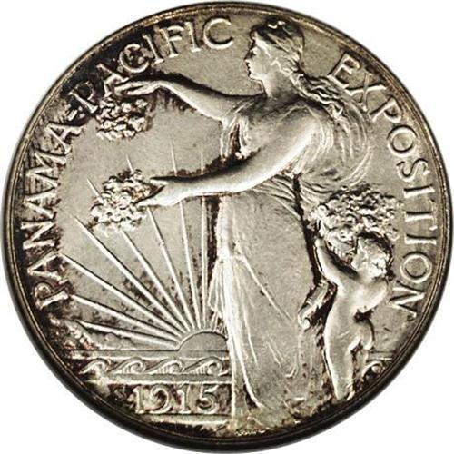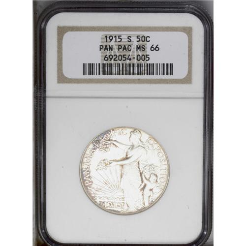 <B>1915-S<50C> Panama-Pacific MS66 NGC.</B></I> Freckles of golden-brown and plum patina outline the borders and design elements, and the left obverse border exhibits hints of navy-blue toning. The satiny fields and devices are mostly brilliant. A well preserved example of this better commemorative type. The mintmark is lightly repunched east.