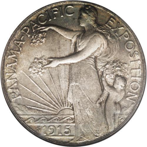<B>1915-S 50C Panama-Pacific MS66 NGC.</B></I> This is a delightful Gem with faint golden-brown toning over lustrous pearl surfaces. Splashes of lighter gold and blue-green color are visible on both sides. This example has a sharp strike and minimal surface marks. Cornelius Vermeule, in his classic <I>Numismatic Art in America</B></I> (1971), writes of this coin, "The obverse is a halfway point between the designs on French silver coins early in the new century and A.A. Weinman's 'Walking Liberty' for the half-dollar which appeared in 1916."<BR><BR><b>Shipping:</b> Coins & Currency (<a target="_blank" href="http://www.heritageauctions.com/common/shipping.php">view shipping information</a>)