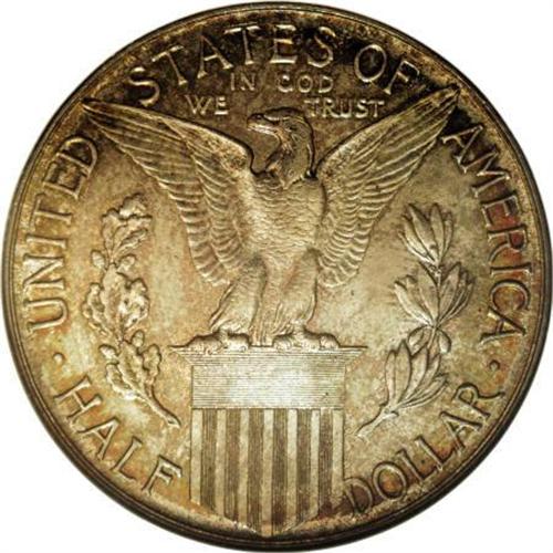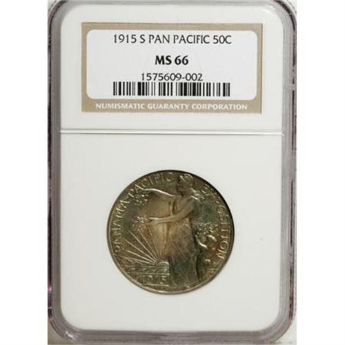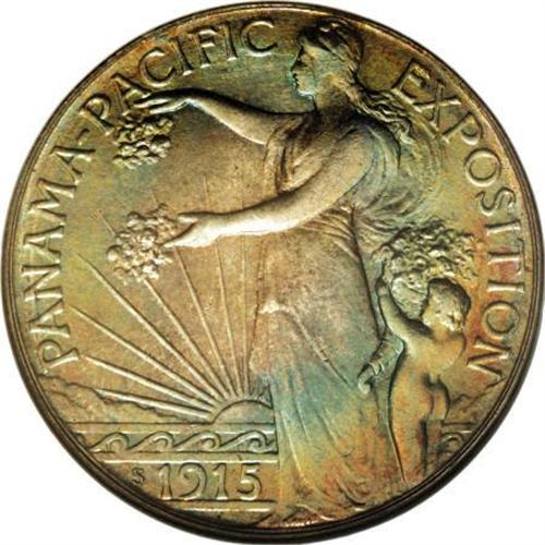 <B>1915-S 50C Panama-Pacific MS66 NGC.</B></I> This design was a collaboration between Charles Barber and George T. Morgan, two of the old guard of the U.S. Mint engraving staff. Barber designed the obverse, here toned over in orange, forest-green, sky-blue, and violet, while Morgan handled the reverse, patinated in similar colors on the lustrous and well struck piece offered here.<BR><BR><b>Shipping:</b> Coins & Currency (<a target="_blank" href="http://www.heritageauctions.com/common/shipping.php">view shipping information</a>)