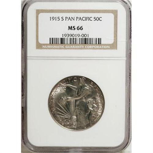 <B>1915-S 50C Panama-Pacific MS66 NGC.</B></I> Essentially brilliant surfaces with frosty silver luster. Both sides have a thin veil of lilac toning at the very borders, and exhibit an exceptionally sharp strike on the design elements. The connoisseur is sure to fall in love with this beautiful commemorative. This was the first commemorative half dollar since the 1892 and 1893 World's Columbian Exposition halves.<BR><BR><b>Shipping:</b> Coins & Currency (<a target="_blank" href="http://www.heritageauctions.com/common/shipping.php">view shipping information</a>)