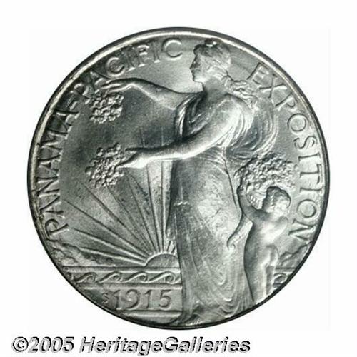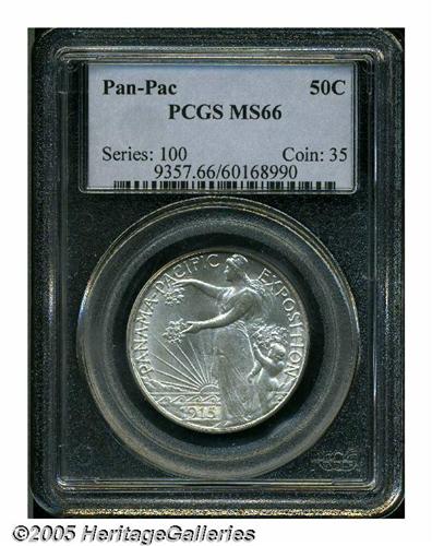 <B>1915-S<50C> Panama-Pacific MS66 PCGS.</B></I> Although examples have received higher grades, this one meets or exceeds all others that we have seen for overall aesthetic appeal. The surfaces are fully brilliant with frosty silver luster. A wonderful Gem quality example that will appeal to nearly any collector.