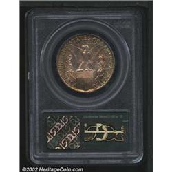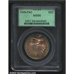 1915-S 50C Panama-Pacific MS66 PCGS. Attractive peripheral gold and green patina frames the lilac tinted centers. A well struck Commemorative with flashy luster. A few minor abrasions in the lower right shield are mentioned only for accuracy.From the Tom Valos Collection. Important notice: We expect to be auctioning lots at the rate of 200-250 per hour. Sometimes eBay Premier live bid software cannot keep up with that pace, so we strongly recommend that you place a realistic proxy bid now as insurance to avoid disappointment. Also please note that all Heritage/CAA lots purchased through eBay Premier carry a 20% Buyer's Premium.