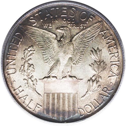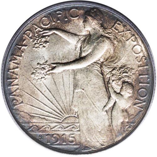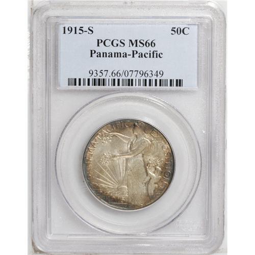 <B>1915-S<50C> Panama-Pacific MS66 PCGS.</B></I> Blushes of cobalt-blue and autumn-brown toning adorn the peripheries. Satin luster bathes this well struck and undisturbed Premium Gem. Only a couple of pinpoint ticks on Liberty's neck prevent a higher grade. The Panama-Pacific half dollar is a better type, seldom seen above the MS65 level.