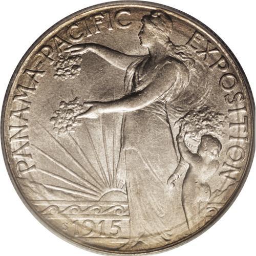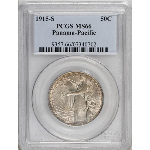 <B>1915-S 50C Panama-Pacific MS66 PCGS.</B></I> Only the second commemorative half coined by the United States, the Panama-Pacific would also have the lowest mintage of any such piece until 1921. This Premium Gem is well struck with pretty luster. Even, pale golden toning covers most of the coin, though a thin ring appears at the periphery of each side, russet on the obverse and charcoal-gray on the reverse.<BR><BR><b>Shipping:</b> Coin/Currency (<a target="_blank" href="http://www.heritageauctions.com/common/shipping.php">view shipping information</a>)