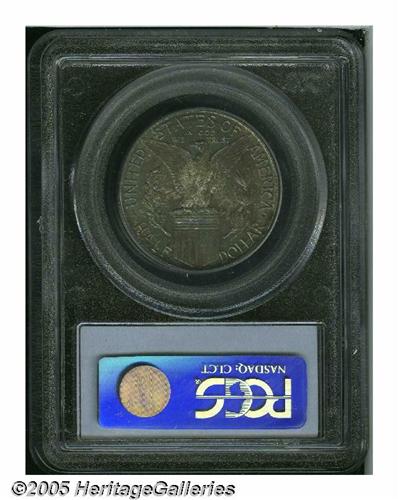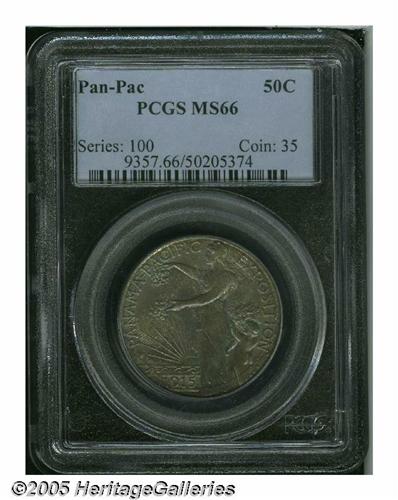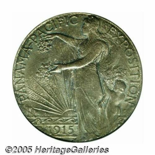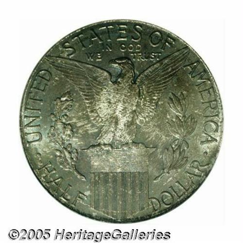 <B>1915-S<50C> Panama-Pacific MS66 PCGS.</B></I> This is a toned Gem that is sure to please the color aficionado. Both surfaces have deep olive-brown toning with splashes of cobalt among the devices. Hints of original silver coloration remain. A highly desirable and appealing Gem.