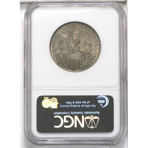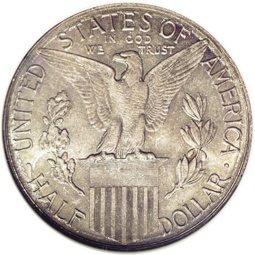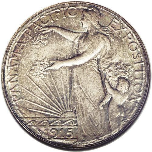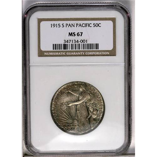 <B>1915-S<50C> Panama-Pacific MS67 NGC.</B></I> As most of our sales show, the 1915-S, although a conditionally challenging issue in the Commemorative series, is usually obtainable for a price as a Gem. Superb Gems, on the other hand, are undeniably rare, and this MS67 example illustrates this point. Deep, original silver-gray patina is accented with hues of pink, blue-green, and crimson as the coin turns under a light. A well concealed milling mark is noted on Liberty's thigh and is the only mentionable handling mark. A beautiful, fully original, and important coin. Census: 57 in 67, 0 finer (5/06).