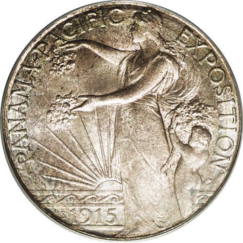 <B>1915-S<50C> Panama-Pacific MS67 PCGS.</B></I> Both sides are thickly toned in mottled brownish patina, with glints of ice-blue and mauve at the rims. Bold luster emanates from beneath, and perusal with a loupe reveal no singular abrasions. Another high-end and lovely commemorative, nearly unsurpassed at either service. Population: 70 in 67, 2 finer (8/06).<BR><I>From The Troy Wiseman Collection.</B></I>