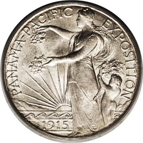 <B>1915-S<50C> Panama-Pacific MS67 PCGS.</B></I> Ex: Richard Jewell. The Panama-Pacific Exposition was designed to attract attention, draw visitors to San Francisco, and make money for the city, in addition to showing that it had fully rebounded from the ashes of the 1906 earthquake. The exposition was a great success, and numismatically it was equally successful. Curiously, the ANA was "a dismal failure" according to Q. David Bowers, even though it was held that year in San Francisco also. The Pan-Pac half dollar has long been one of the keys to the commemorative series. It is available for a price in lower grades, but Superb coins such as this one are rare indeed. The mint luster on this piece is perhaps its most singular and exceptional aspect. Softly frosted, the luster swirls around the surfaces and is virtually unaffected by abrasions. The obverse is mostly brilliant with just the slightest hint of color on that side, while the reverse displays rich olive toning with rose accents around the periphery. Outstanding quality.