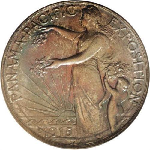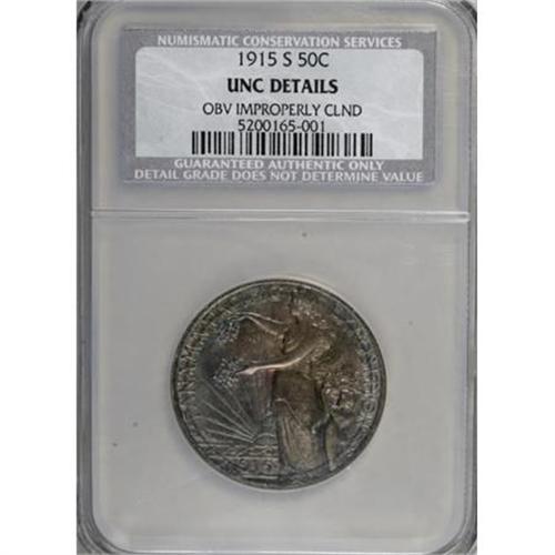 <B>1915-S 50C Panama-Pacific Half Dollar--Obverse Improperly Cleaned--NCS. Unc Details.</B></I> Both sides of this well struck Panama-Pacific half exhibit rich blue, rose, and plum patina. While the reverse displays strong luster, the obverse is somewhat dulled with hairlines from cleaning. Still, a surprisingly attractive example of this earlier commemorative half.<B><BR></B></I><I>From The Diemer L. Fife Collection.</B></I><BR><BR><b>Shipping:</b> Coins & Currency (<a target="_blank" href="http://www.heritageauctions.com/common/shipping.php">view shipping information</a>)