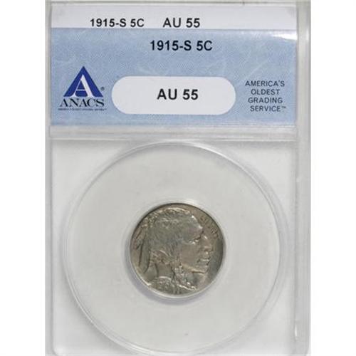 <B>1915-S 5C AU55 ANACS.</B></I> . NGC Census: (20/405). PCGS Population (17/594). Mintage: 1,505,000. Numismedia Wsl. Price for NGC/PCGS coin in AU55: $367. (#3929)<BR><BR><B>Coin Engraver:</B> James E. Fraser<BR><BR><b>Shipping:</b> Coins & Currency (<a target="_blank" href="http://www.heritageauctions.com/common/shipping.php">view shipping information</a>)