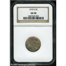 <B>1915-S 5C AU58 NGC.</B></I> Very light friction shows on the highpoints of this nicely detailed S-mint Buffalo Nickel, and considerable luster remains on the gold-gray surfaces, which show no serious contact marks. Lot:5963