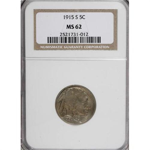 <B>1915-S 5C MS62 NGC.</B></I> Beautifully deep rose-brown coloration adorns the surfaces of this satiny example. The design motifs are crisply produced on both sides, even above the knot in the Indian's hair braid and on the bison's shoulder. The rim is a bit uneven on the left side of the reverse, as struck. Two or three tiny marks on the Indian's cheek limit the grade. <BR><BR><B>Coin Engraver:</B> James E. Fraser<BR><BR><b>Shipping:</b> Coins & Currency (<a target="_blank" href="http://www.heritageauctions.com/common/shipping.php">view shipping information</a>)
