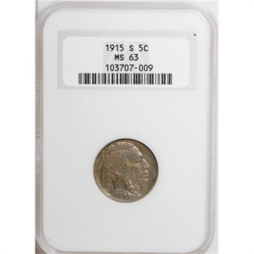 <B>1915-S 5C MS63 NGC.</B></I> Chestnut-brown and lilac visit the shimmering and unmarked surfaces. Carbon is inconsequential, and most design elements are sharply struck. In a former generation holder.<BR><BR><B>Coin Engraver:</B> James E. Fraser<BR><BR><b>Shipping:</b> Coins & Currency (<a target="_blank" href="http://www.heritageauctions.com/common/shipping.php">view shipping information</a>)