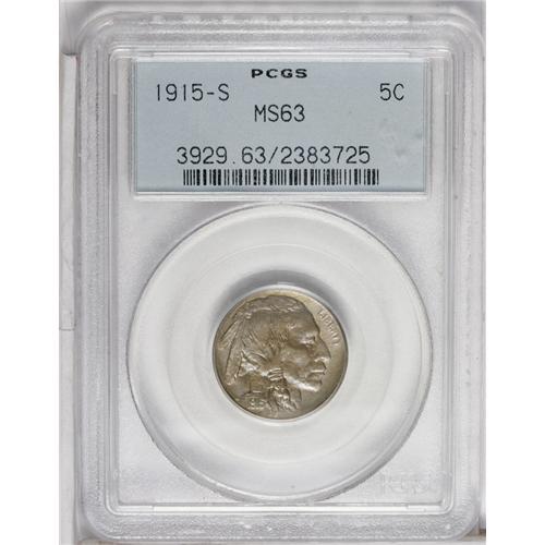 <B>1915-S<5C> MS63 PCGS.</B></I> Exquisite aqua-blue and apricot toning envelops this satiny and unmarked representative. Well struck for the issue, with slight softness on LIBERTY and above the Indian's braid. The 1915-S is among the lowest mintage issues. Housed in a green label holder.<BR><I>From The Tide Collection.</B></I>