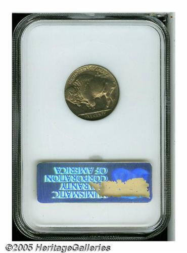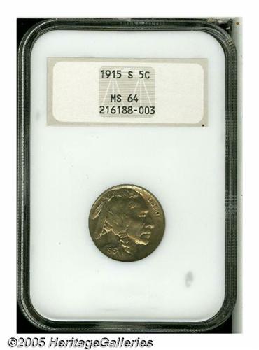 <B>1915-S<5C> MS64 NGC.</B></I> The 1915-S is scarce when found above Fine condition, but in Uncirculated grades it is decidedly rare. The near-Gem offered here displays lustrous surfaces overlain with a thin veneer of pastel light green, rose, and light gold patination. The design elements are well struck, though LIBERTY is somewhat mushy, as is typical of the date. The bison exhibits excellent definition, except for a small flat spot in the hair above the forehead.