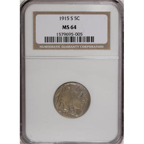<B>1915-S 5C MS64 NGC.</B></I> Golden-tan and violet patina is slightly deeper on the obverse of this highly lustrous near-Gem. Impeccably preserved surfaces exhibit sharply struck design elements.<BR><BR><B>Coin Engraver:</B> James E. Fraser<BR><BR><b>Shipping:</b> Coins & Currency (<a target="_blank" href="http://www.heritageauctions.com/common/shipping.php">view shipping information</a>)