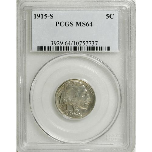 <B>1915-S 5C MS64 PCGS.</B></I> This low mintage near-Gem has cream-gray toning and a paucity of marks. Moderately soft in the centers, as usually seen, but the date and mintmark are bold.<BR><BR><b>Shipping:</b> Coins & Currency (<a target="_blank" href="http://www.heritageauctions.com/common/shipping.php">view shipping information</a>)