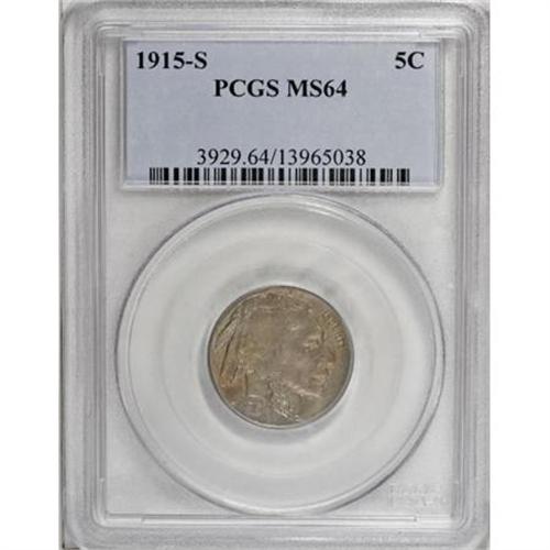 <B>1915-S 5C MS64 PCGS.</B></I> This low mintage branch mint nickel is richly toned in dove-gray and golden-tan. The centers and tail show some blending of detail, but the strike is generally precise for the issue.<BR><BR><B>Coin Engraver:</B> James E. Fraser<BR><BR><b>Shipping:</b> Coins & Currency (<a target="_blank" href="http://www.heritageauctions.com/common/shipping.php">view shipping information</a>)