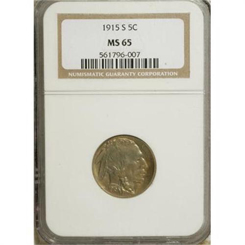 <B>1915-S 5C MS65 NGC.</B></I> The strike and luster are uncommonly strong for this often-mediocre issue, and the pink-accented yellow-orange patina that graces both sides greatly enhances the overall eye appeal. By 1915, few individuals saved new Buffalo nickels as a matter of course, and between the low mintage of just over 1.5 million pieces, the often-weak strike, and the low Mint State survival rate, a sharp Gem such as the present piece is an elusive find. Census: 55 in 65, 24 finer (3/08).<BR><BR><B>Coin Engraver:</B> James E. Fraser<BR><BR><b>Shipping:</b> Coins & Currency (<a target="_blank" href="http://www.heritageauctions.com/common/shipping.php">view shipping information</a>)
