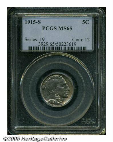 <B>1915-S<5C> MS65 PCGS.</B></I> The 1915-S is scarce when found above Fine condition. But in Uncirculated grades it is decidedly rare and Gems are considered an R.4. This is a well struck example that exhibits bright, frosted mint luster and just a hint of pale golden toning on the obverse. An exceptional coin that is clearly suggestive of an even higher grade. Population: 87 in 65, 28 finer (6/05).