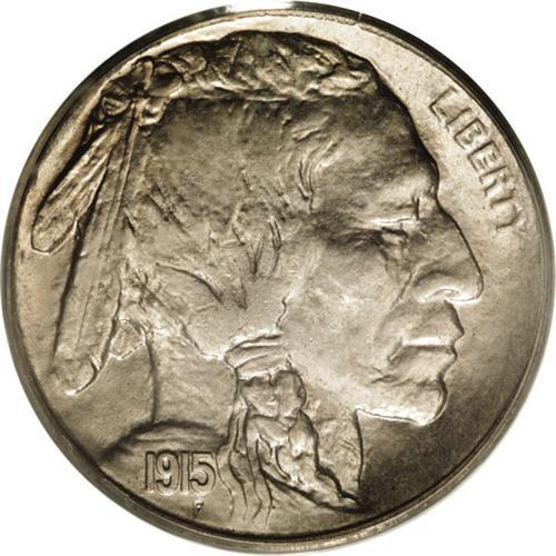 <B>1915-S<5C> MS66 PCGS.</B></I> This pristine Premium Gem is virtually abrasion-free, with light gold patination and highly lustrous surfaces. Lange comments that "choice and gem examples are genuinely rare," which is borne out by the major grading services that together have graded 45 pieces at this level. The strike is considerable better than average, although a bit soft at the very top of the buffalo's back and on the shoulder. There are no spots or notable distractions of any kind on this exceedingly appealing piece. Certified in a green label holder. Population: 26 in 66, 3 finer (4/06).