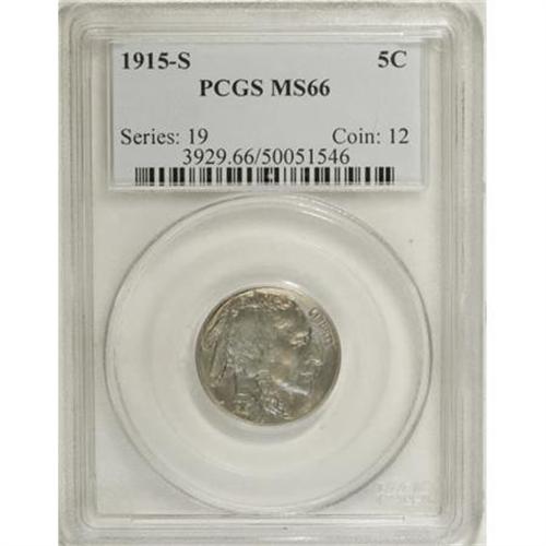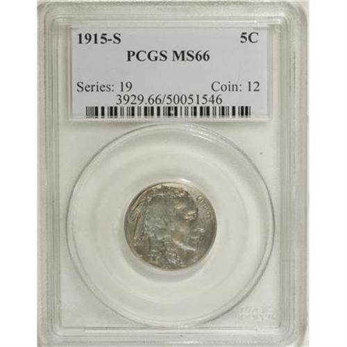 <B>1915-S 5C MS66 PCGS.</B></I> The 1915-S nickel is a scarce date, and rare in the better grade levels of Mint State. The issue also tends to be poorly struck. This Premium Gem displays dazzling luster and a thin coat of gold, lilac, and light blue patina. The strike is much better than average, with no areas showing hints of weakness. Well preserved throughout. Population: 26 in 66, 3 finer (6/07).<BR><BR><b>Shipping:</b> Coins & Currency (<a target="_blank" href="http://www.heritageauctions.com/common/shipping.php">view shipping information</a>)