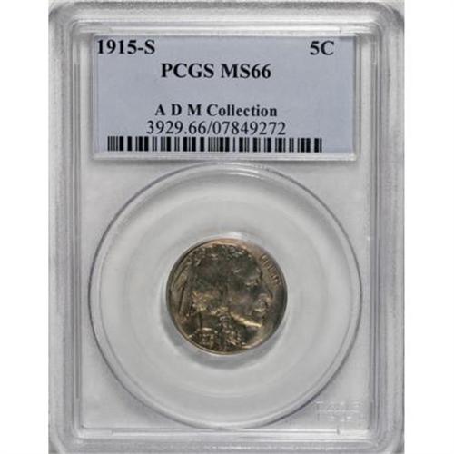 <B>1915-S 5C MS66 PCGS.</B></I> Ex: ADM Collection. One of the scarcer issues among the early Buffalo nickels. Unlike most examples seen, this piece is sharply defined on both obverse and reverse. The surfaces have a pronounced matte-like texture with an overlay of mint frost. Even golden toning completes the picture of this superior example with the slightest accent of lilac on the highpoints. Population: 28 in 66, 3 finer (8/07).<BR><BR><B>Coin Engraver:</B> James E. Fraser<BR><BR><b>Shipping:</b> Coins & Currency (<a target="_blank" href="http://www.heritageauctions.com/common/shipping.php">view shipping information</a>)
