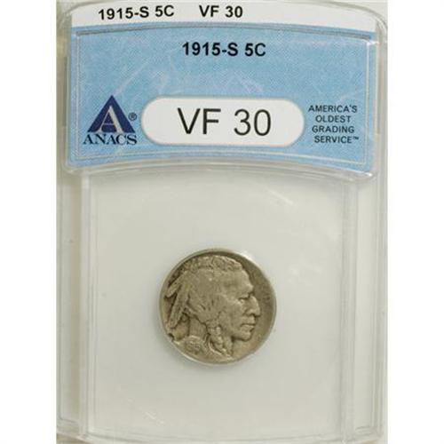 <B>1915-S 5C VF30 ANACS.</B></I> NGC Census: (11/440). PCGS Population (5/646). Mintage: 1,505,000. Numismedia Wsl. Price for NGC/PCGS coin in VF30: $184. (#3929)<BR><BR><b>Shipping:</b> Coins & Currency (<a target="_blank" href="http://www.heritageauctions.com/common/shipping.php">view shipping information</a>)