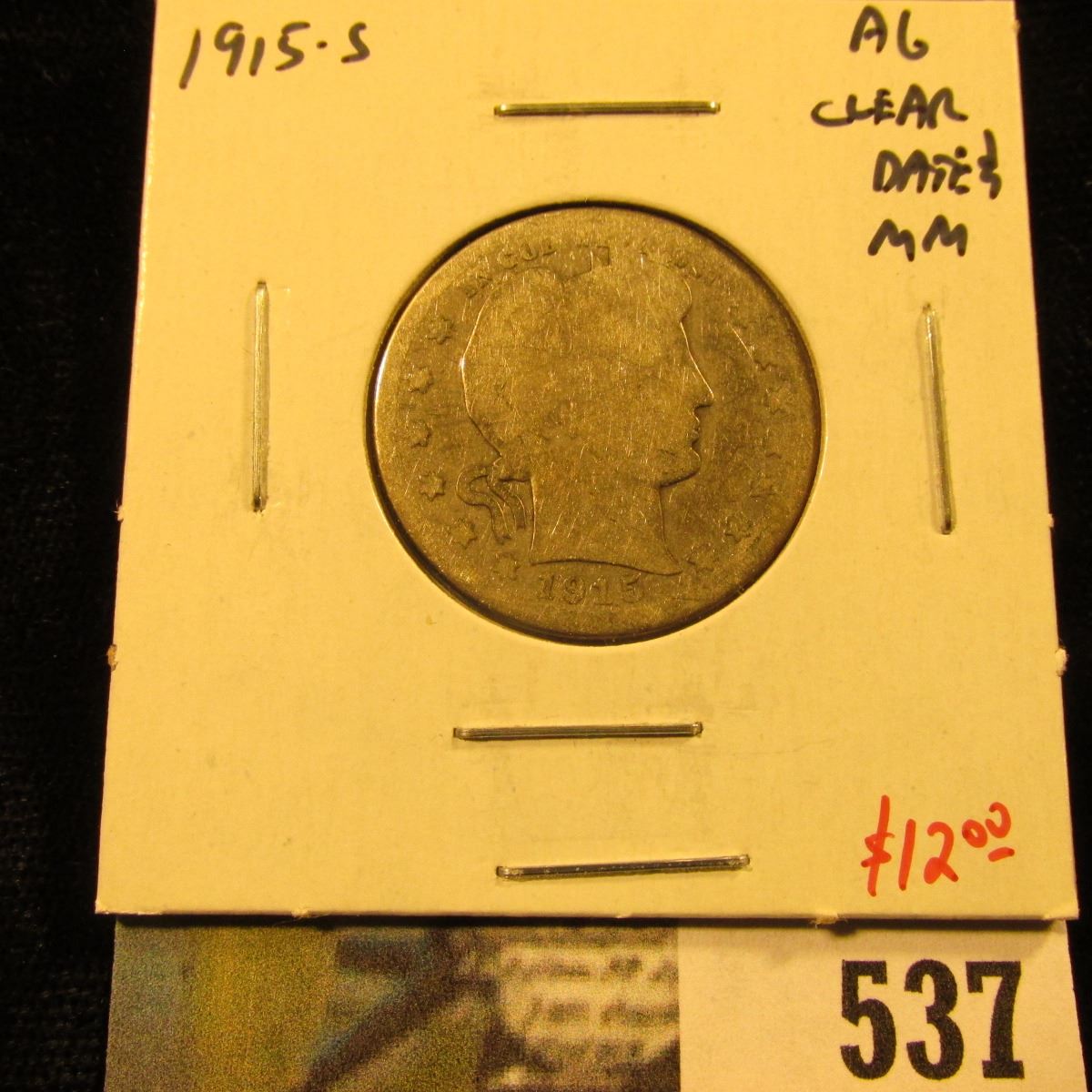 1915-S Barber Quarter, AG clear date & mint mark, low mintage semi-key, value $12