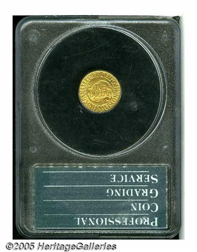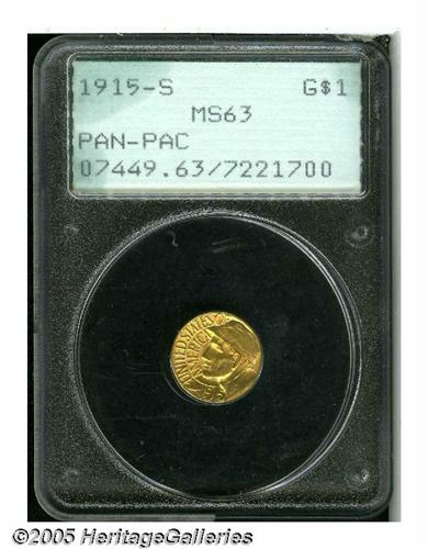 <B>1915-S<G$1> Panama-Pacific Gold Dollar MS63 PCGS.</B></I> A well struck lemon-gold representative that has the look of a higher grade. Encapsulated in a first generation holder.