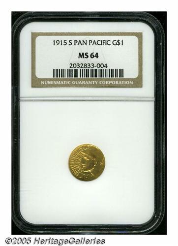 <B>1915-S<G$1> Panama-Pacific Gold Dollar MS64 NGC.</B></I> Even medium golden-orange coloration is paired with sparkling mint luster on this clean, upper-end gold dollar.