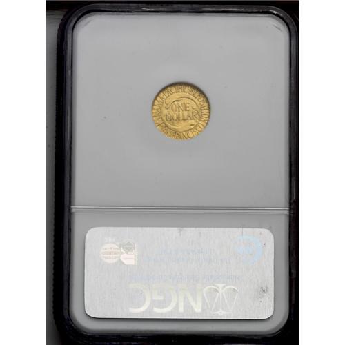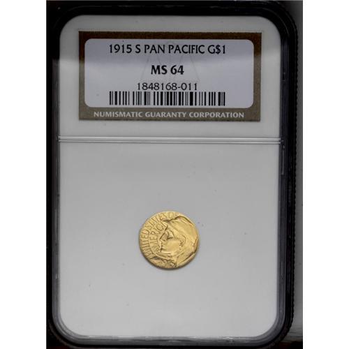 <B>1915-S<G$1> Panama-Pacific Gold Dollar MS64 NGC.</B></I> This honey-gold commemorative has just a few too many marks to be a Gem, but the solid strike and pleasing luster give it great eye appeal.
