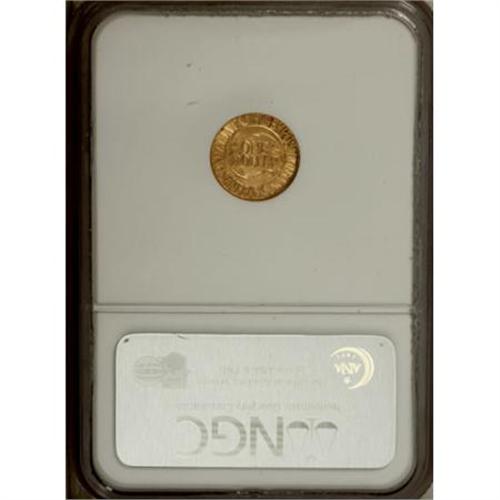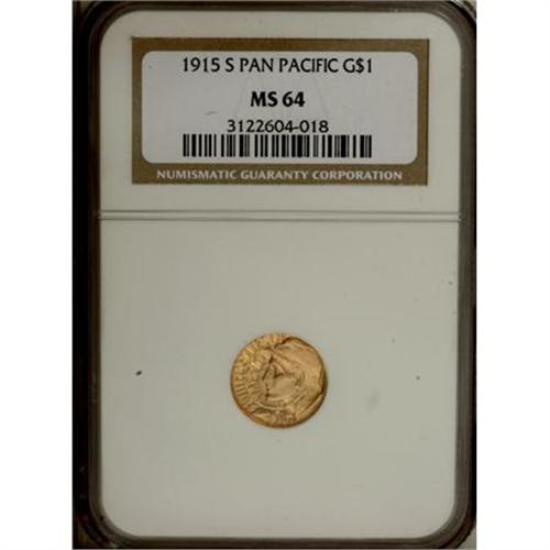 <B>1915-S G$1 Panama-Pacific Gold Dollar MS64 NGC.</B></I> This near-Gem seems better struck than the average specimen, with sharper-than-usual definition on the canal laborer's ear and cap, and on the symbolic dolphins on the reverse. Satiny and essentially unmarked, with even honey-gold coloration and faint rose accents in the fields. <BR><I>From The John Stimson, Sr. Collection, Part Two.</B></I><BR><BR><b>Shipping:</b> Coins & Currency (<a target="_blank" href="http://www.heritageauctions.com/common/shipping.php">view shipping information</a>)