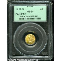 <B>1915-S G$1 Panama-Pacific Gold Dollar MS64 PCGS.</B></I> Exceptional for the grade, this lustrous lemon-gold example is unabraded and attractive. Certified in a prior generation holder.